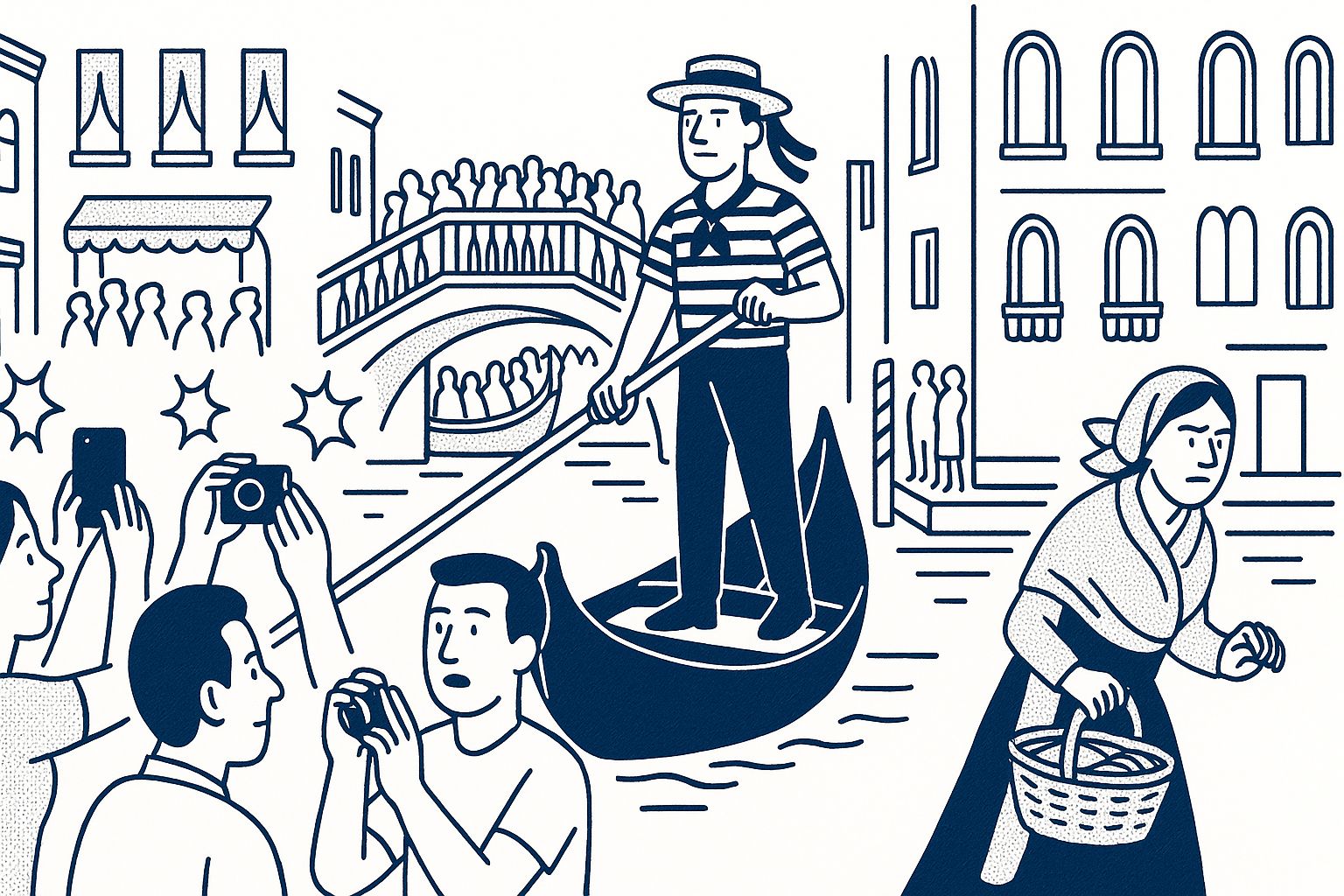 In the heart of Venice, a gondolier navigates through flashes and raised phones. Shop windows sell magnets, t-shirts, and little bags of “typical” rice, while a resident tries to weave through the crowd to reach the market. Here, the city presents itself as a life-sized souvenir.