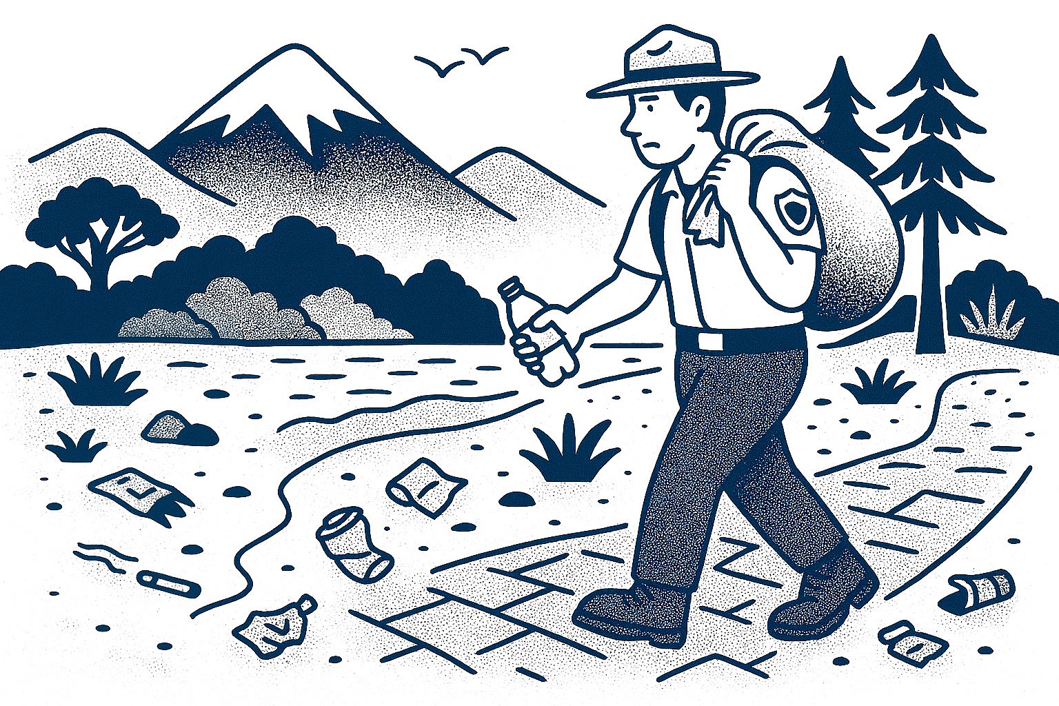 On a mountain trail still covered in mist, a park ranger walks with weary steps. Every few meters he stops: to pick up a crushed plastic bottle, a shiny wrapper hidden under a rock, a cigarette butt extinguished beside wildflowers.