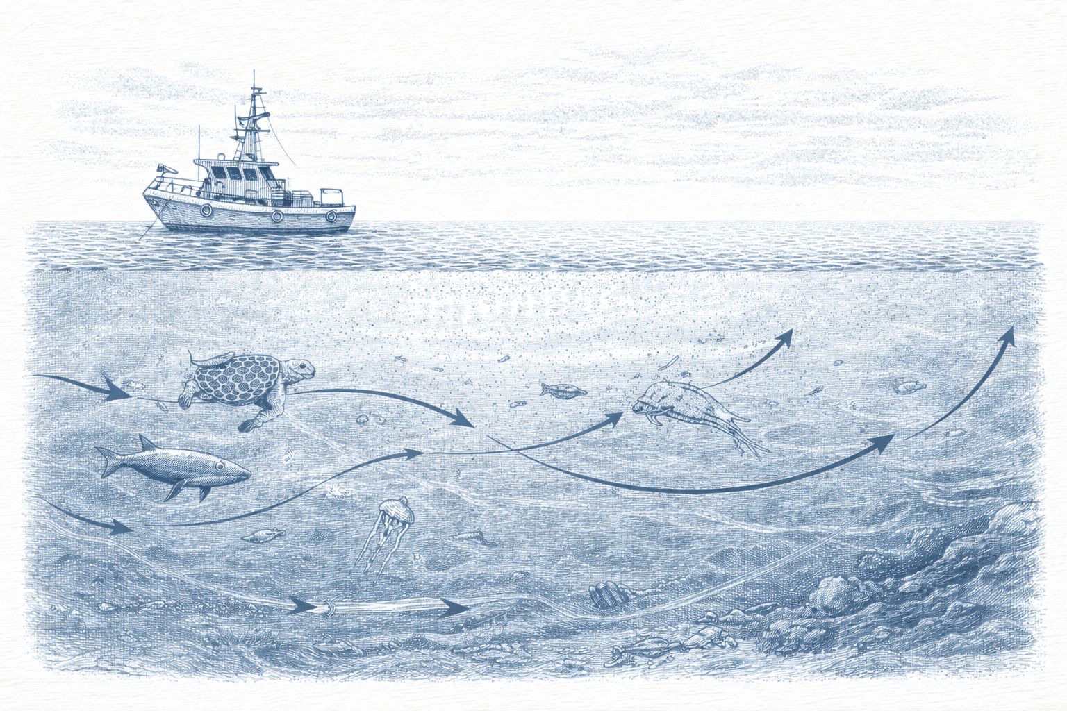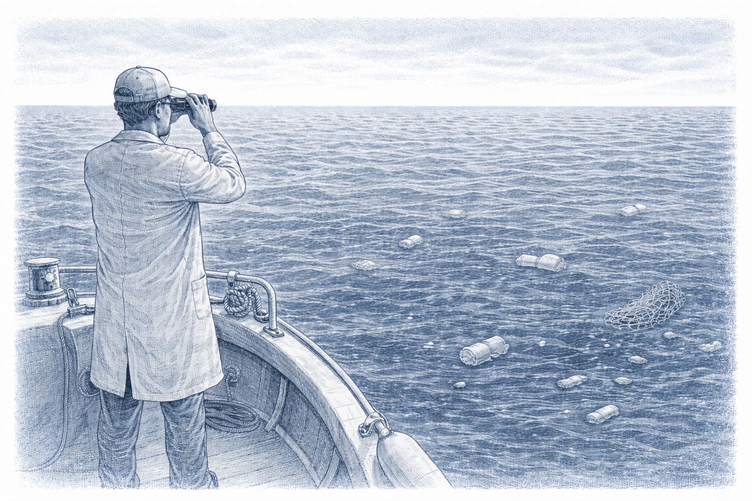 The researcher moves across the open sea, far from any visible coastline. Around them, the ocean appears intact: deep blue, a clean horizon, silence broken only by the engine of the vessel.