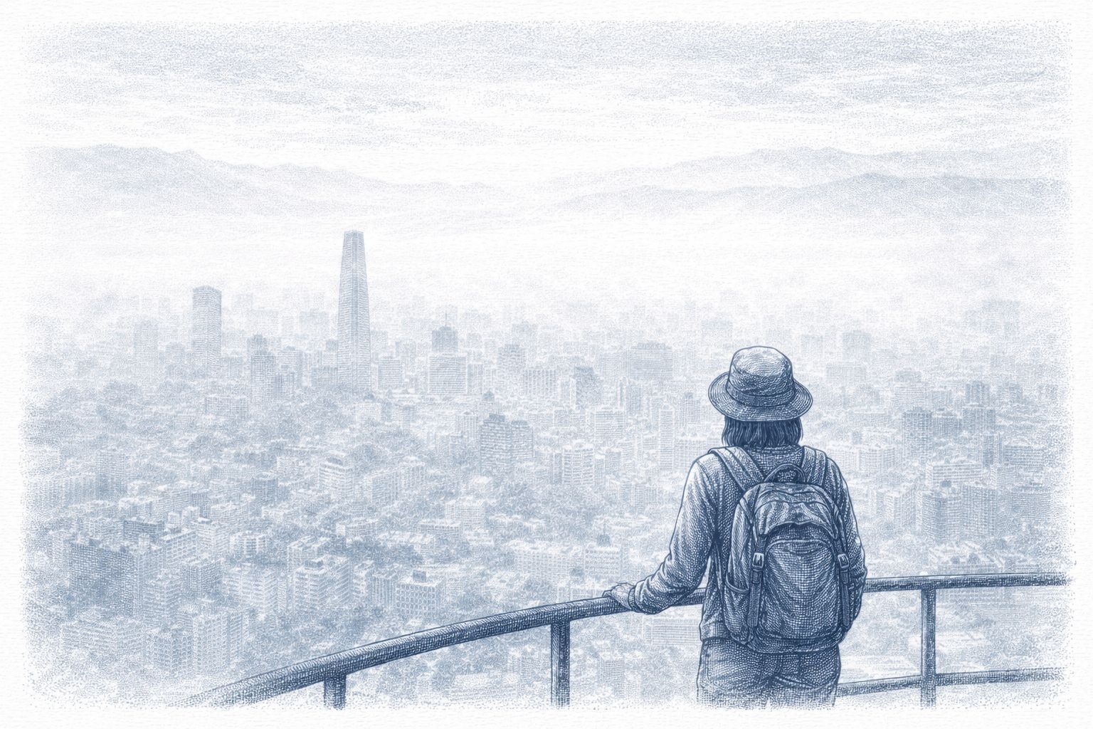 Olivia pauses at the viewpoint. The city unfolds in layers: avenues, skyscrapers, mountains barely visible in the distance. A soft haze wraps around the skyline and, for a moment, it feels like part of the city’s charm.
